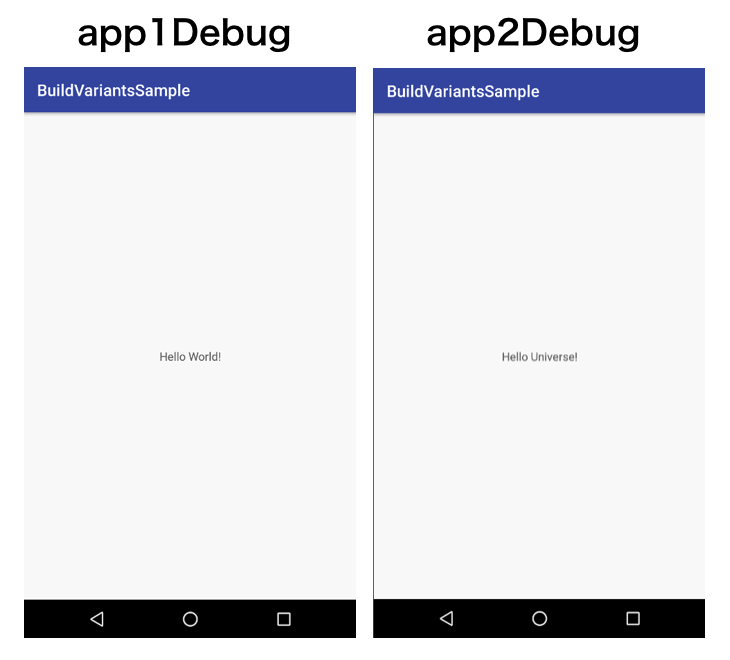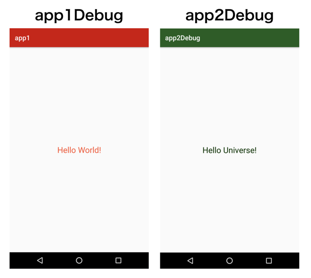を含むビルドバリアントでビルドすると、それぞれで別アプリとしてビルドされます。メインソースセットよりプロダクトフレーバーのソースセットの優先度が高いためです。Gradleはビルド時により優先度の高いソースセットを利用します。また、プロダクトフレーバー毎に別々の署名設定を追加することも可能です。